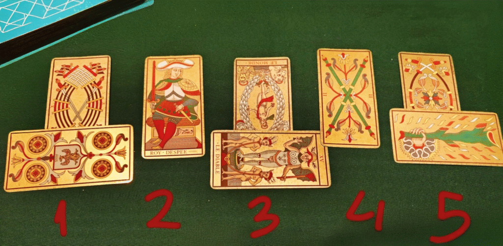 El Cuatro de Oros nos recuerda mantener estabilidad y seguridad, pero con flexibilidad; mientras que el Rey de Espadas aconseja actuar con claridad, sabiduría y firmeza, tomando decisiones desde la conciencia y la imparcialidad.