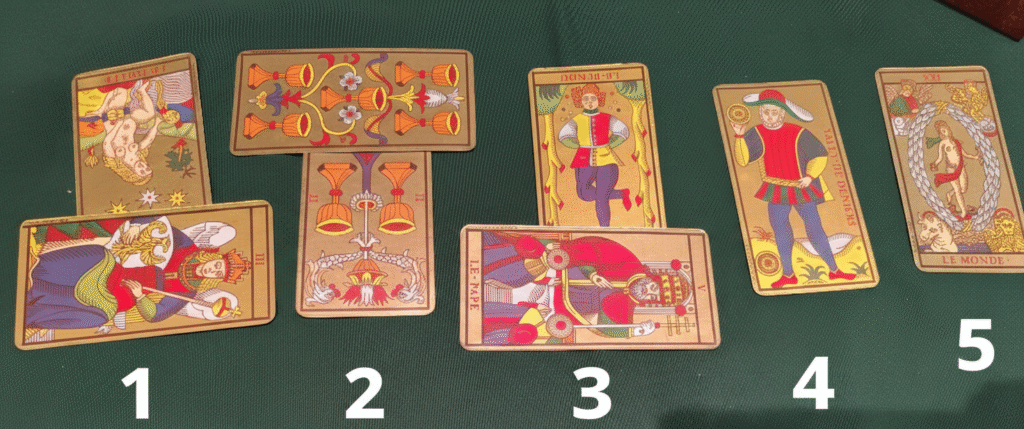 El Cinco de Copas aparece como apoyo, transmitiendo un mensaje de transición del dolor del pasado hacia la aceptación y la sanación. Invita a aprender de las decepciones, dejar de centrarse en la pérdida y reconocer los aspectos positivos que aún permanecen.